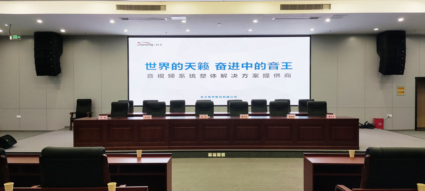 该会议室面积达470平米,是召开大型会议、演出等的主要场所。为满足该会议厅的多功能性,音王扩声系统选用G系列线阵列音箱,两路二分频系统,由2个44mm的高音压缩单元和两个8寸低音单元构成一个动态余量极大的组合,并大大降低了箱体的重量,提供极高的声压/体积比。通过一个平面波转换器将高频声频波形由球面波转换为等相位平面波,极大减少了高频干涉效应,使远距离下声音清晰度大大提高。同时结合一个指数曲线恒指向号筒,产生一个一致的波阵面。箱体为梯形,箱体与箱体之间的间隙已经缩到最小,从而减少了整组阵列的无效发声区,最小化阵列的垂直旁瓣。 箱体上装配有精密铝合金吊装系统,箱体与箱体的连接角度可调整箱体背部的连接杆在0°- 6°之间任意调整,以满足不同场合的需求。箱体表面为耐磨的黑金砂油漆。2个与箱体平齐内嵌的把手安装在音箱两侧,方便搬运。