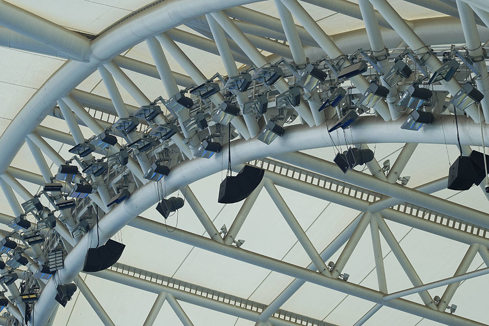 音王为体育场的扩声场所进行了独立的分析和设计,采用TS系列同轴可调指向性音箱和FW系列远程号角音箱,以分散式吊装的安装方式,覆盖整个比赛场地和观众席区域。