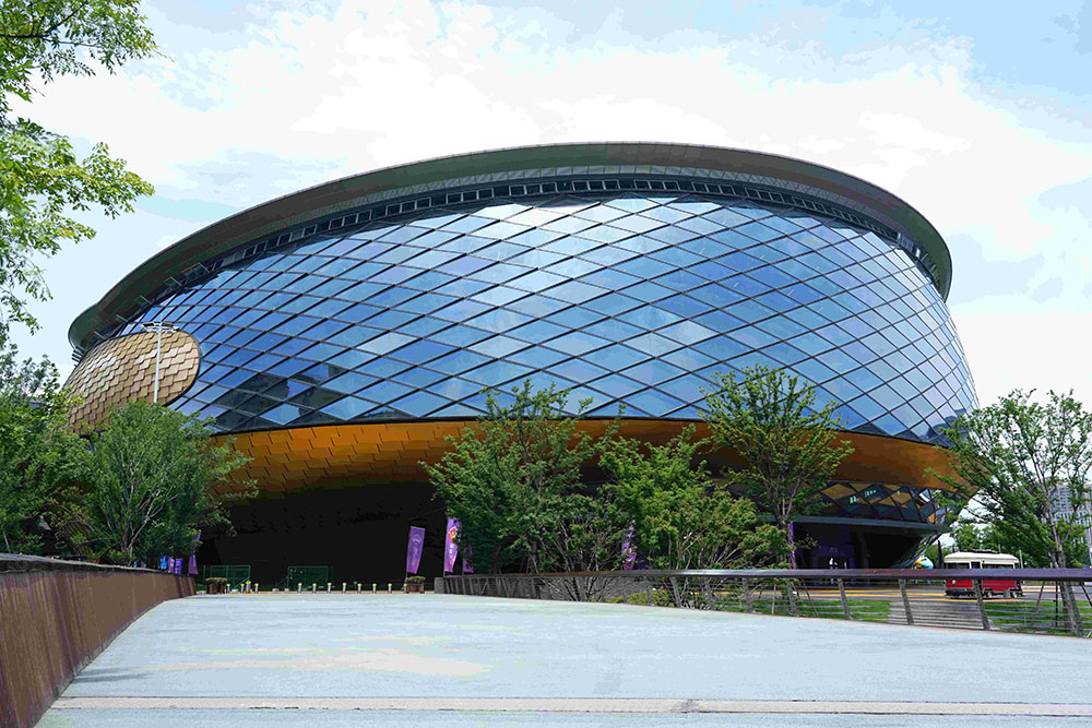 体育馆的设计灵感源自玉器“琮”,经过形态分析和优化调节,形成一个美丽的交叉点。结合丝绸的特性,体育馆曲面形状的布置增加了扩声系统的设计和安装难度。