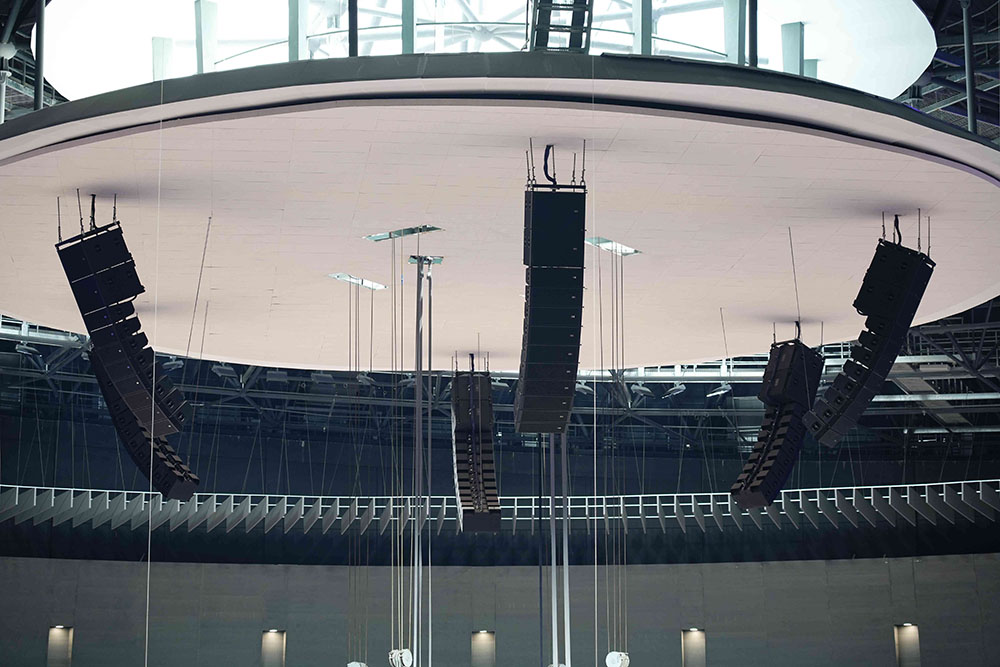 为了避免弧形穹顶设计带来的直接反射声波导致的声聚焦缺陷,音王采用G系列10寸线阵列扬声器系统,既实现对有效扩声区域的均匀覆盖,又保证大声压级和语音清晰度的同时避免有害的声反射,确保比赛扩声效果。