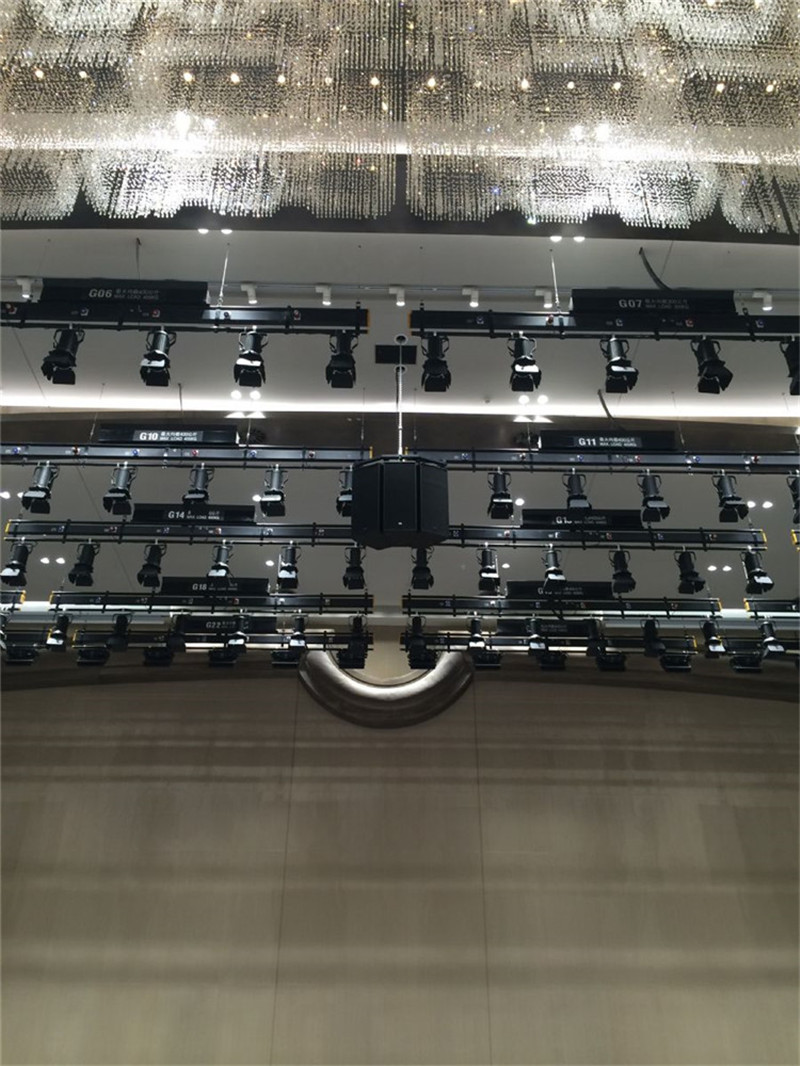位于三层的宴会大厅面积为3300㎡,是峰会的宴会场地,大厅高度为10米,为了使会场达到最好的声音效果,采用了吊挂的方式安装了LINE212-SP有源系列扬声器,该系列独特的Click& Fly®'吊挂系统可以非常便捷的进行垂直或者水平吊挂安装。大厅顶部暗藏安装了36只经典的CA 1215系列扬声器,这样无论是正常使用大厅还是将大厅分割变化为2个独立会议厅都可以得到非常均匀的声场覆盖。这个大厅同样也准备了一套由LINE212-SP+SW 118E-SP组成的有源流动系统以应对不同的会议和活动需求。另外一套由LINE212-SP+CA1215组成的系统应用于午宴厅中。