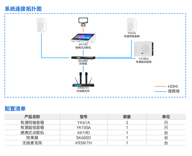 该智能K歌系统包含了一台便携式点歌机KK19D、一套无线麦克风K95R/TH一台专业效果器SK600D、两只有源同轴音箱YK61A,以及一只有源超低音箱YK10SA。