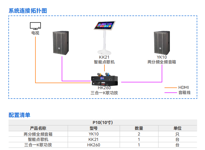 该智能K歌系统包含智能点歌机KK21、三合-K歌功放HK260以及两只两分频全频音箱YK10。其中智能点歌机KK21采用立式设计,支持支架安装,安装过程简便快捷。内置海量正版歌曲,满足多样需求。三合一K歌功放HK260采用光黑面板与3,5寸全彩色触摸屏,载高品质无线话筒,配三进一出HDMI高清接口及多重效果模式,一键切换,适配多种场景。两分频全频音箱YK10内置LC分频器采用了高精度聚丙烯电容器、低损耗线绕电感以及高性能水泥电阻等优质元件,共同营造震撼的听觉效果。箱体采用桦木夹板制作,表面经过水性环保耐刮涂料的处理,既美观又耐用。配备多个M10吊点设计,安装简便,并附有35mm直径托盘,便于稳固支撑。广泛适用于饭店、家庭娱乐及KTV等多种场合,适用于(50-100m²)场景。