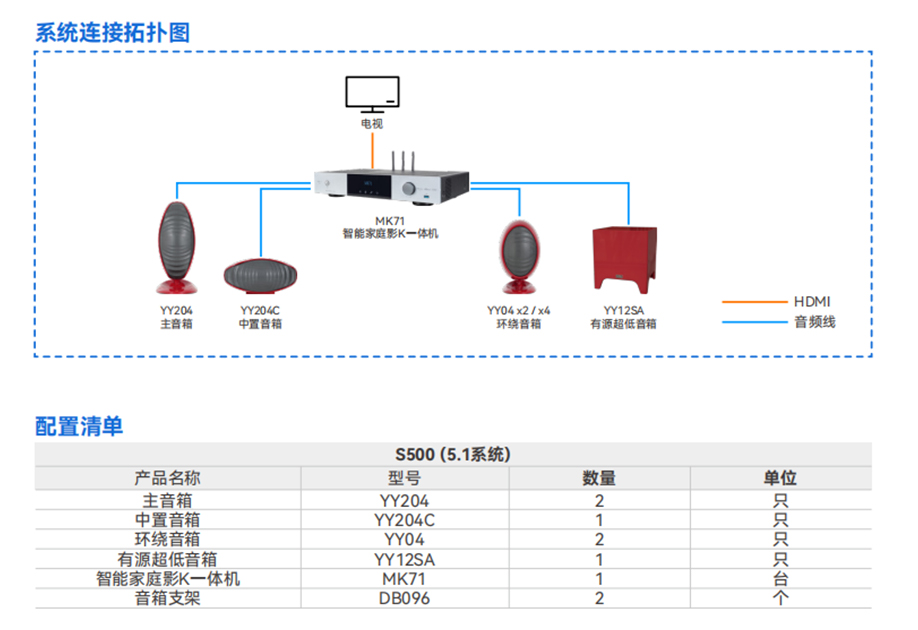 该系列影院系统包括5.1和7.1两种规格,两种规格都具备智能家庭影K一体机MK71、2只主音箱YY204、1只中置音箱YY204C、1只有源超低音箱YY12SA,5.1系统和7.1系统分别具备2只和4只环绕音箱YY04。
